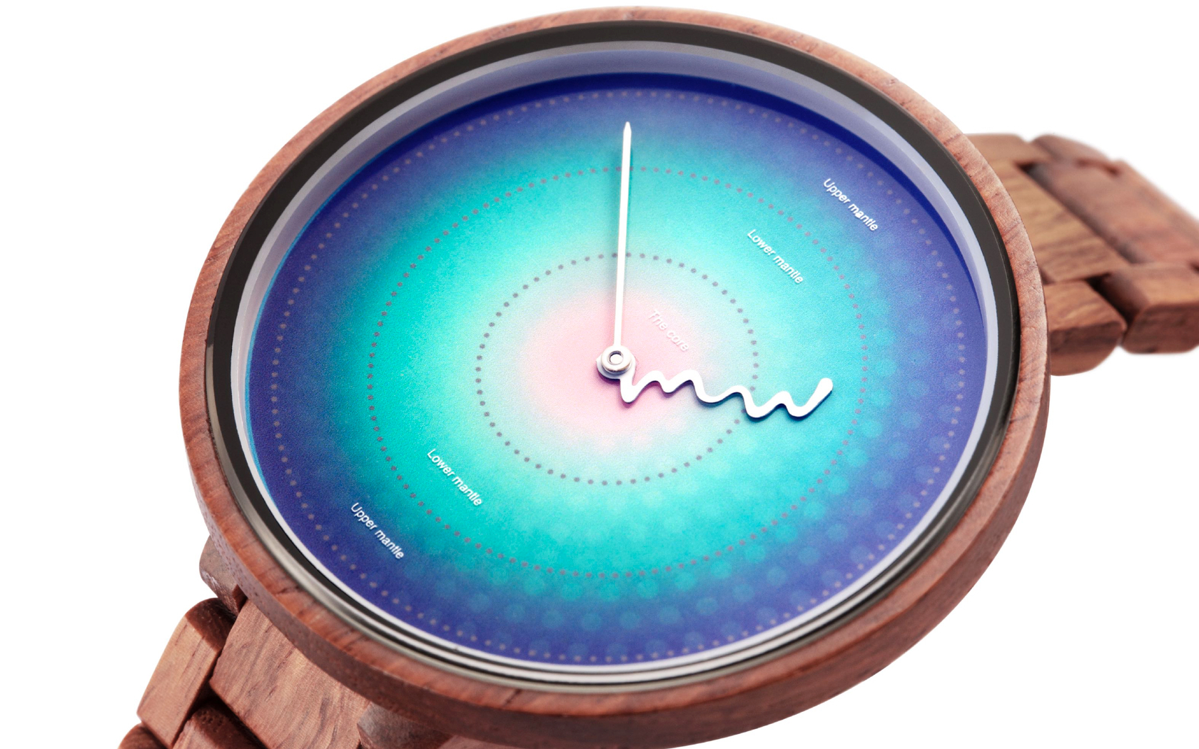 本次的限量版手表设计灵感源自地球的剖面,将地球的剖面结构展示于表盘上,并标上“地心、地幔、地壳”字样,呼吁人们给予我们的母星更多的关注与了解,从而从心地关爱我们的家园。