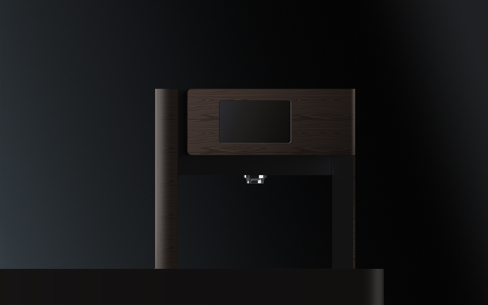 白色的大理石条纹以适应明空间,棕色木质条纹以适应暗空间,金属质地以适应多种环境。