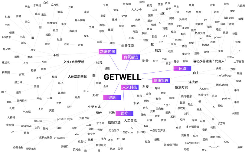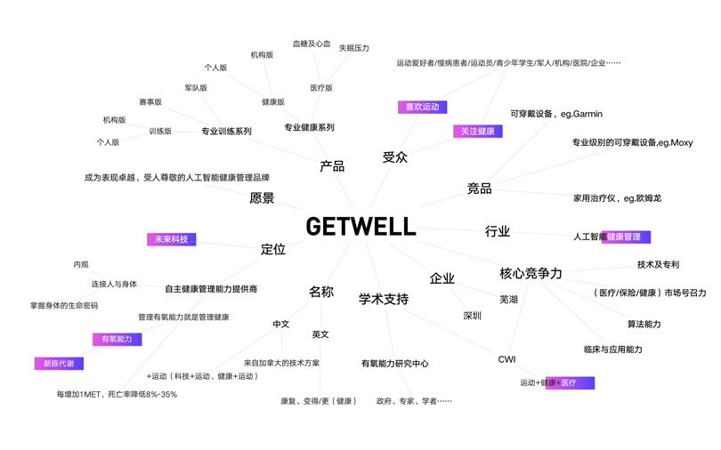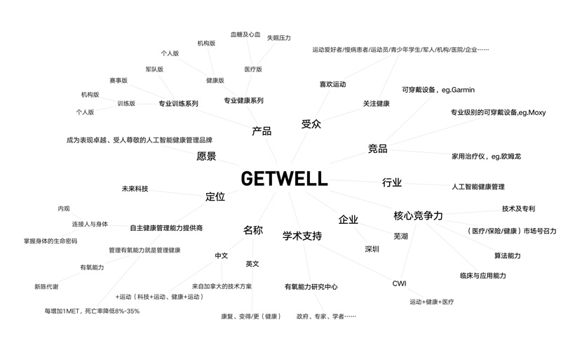 从“产品、受众、竞品、行业、核心竞争力、学术支持、定位、愿景”等众多关键词来看,getwell 的品牌信息无处不在,像一棵无人打理、肆意生长、枝杈纵横的野酸枣树。
