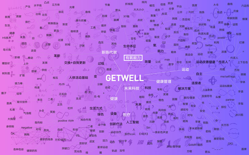 从一级属性推导出去,可以看到 getwell 的受众是喜欢运动、关注健康的;行业是属于“人工智能、健康管理”的;学术性很强的 CWI 是富于“运动、健康、医疗”特质的;定位是“未来科技”感,注重“新陈代谢”和“有氧能力”的。