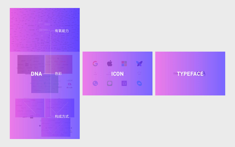 有氧能力是氧气在人体内“摄氧-运氧-用氧”,或者说是“吸收-运输-制造-释放”的循环过程。因此inkey将有氧能力诠释为一个从生到死,循环往复的过程,既是氧气在体内的聚合,也是氧气在体内的消逝。这一理念被运用到icon的描述中,最终 inkey 画出了 getwell 的基因图谱,创造出专属于 getwell 的:有氧能力符号——