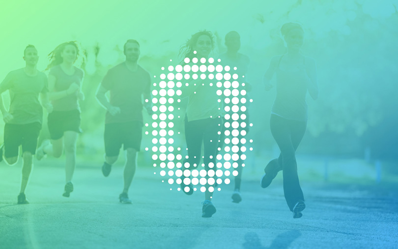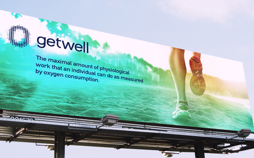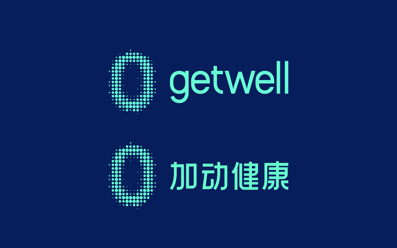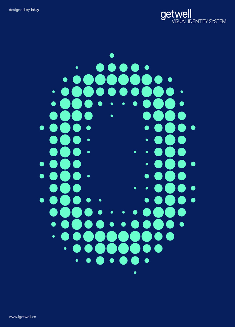 符号是由无数大小不一的圆点组合而成的氧元素 O 的形状,高度凝练的表现了数量庞大的氧分子在人体内运动、聚集、消耗的场景。形态不断变化的氧分子营造出清晰活跃的视觉语言,反映出 getwell 专注有氧能力的活性健康定位。