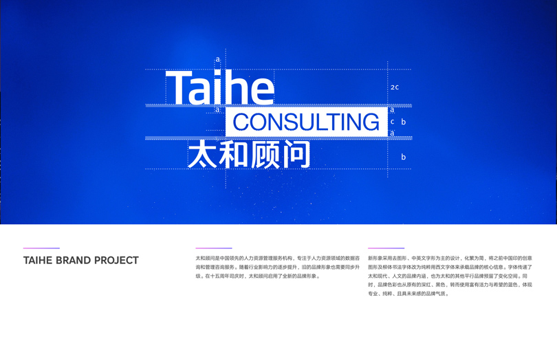 2017年太和顾问成立十五周年,作为人力资源数据与管理咨询综合解决方案领航者,太和顾问以全世界范围作为新起点,从中国红更新为国际篮。inkey 助力太和顾问,化繁为简,用经典字型与色彩,体现了太和顾问专业、纯粹、且具人文感的品牌气质。