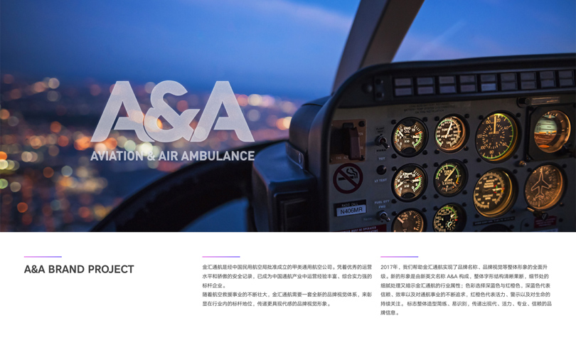 2017年,inkey 助力金汇通航实现了品牌名称、品牌视觉等整体形象的全面升级。新的形象是由新英文名称 A&A 构成,整体字形结构清晰果断,传递出现代、活力、专业、信赖的品牌信息,富有寓意的深蓝色和橙红色展示出了中国通航产业中标杆企业的理想追求。