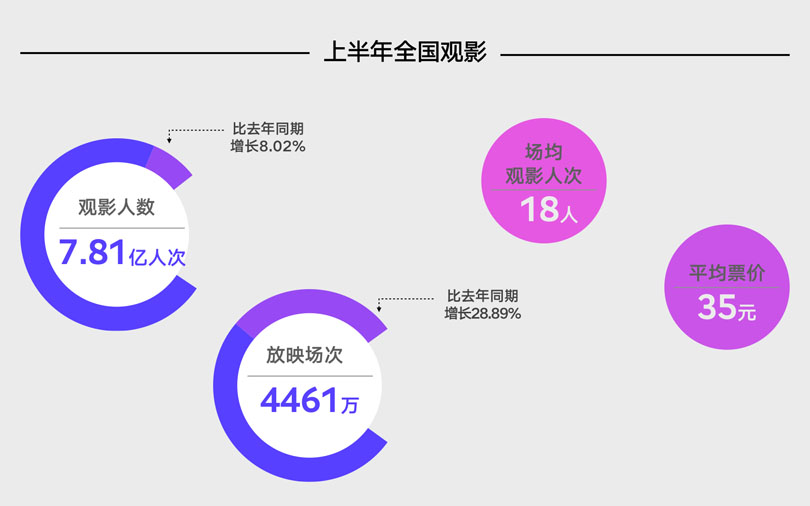 2017年上半年全国观影7.81亿人次,相比去年同期的7.23亿增长8.02%;放映场次达到4461万,相比同期增长28.89%,场均观影人次为18人,平均票价35元。