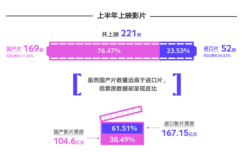 上半年国产影片上映数量为221部,票房104.60亿元,仅占总票房的38.49%。进口片以只有国产品1/3的上映数量(52部),却拥有167.15亿元的票房,占了整体票房的61.51%!